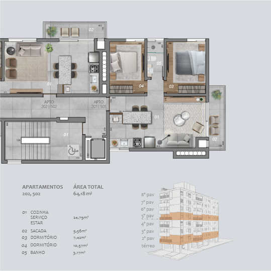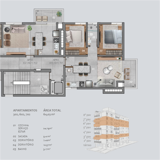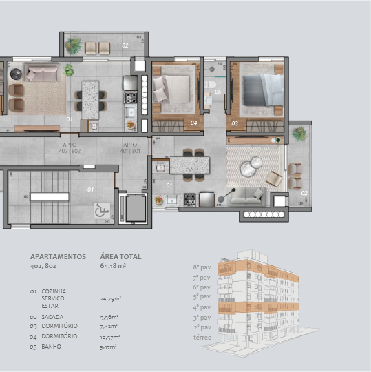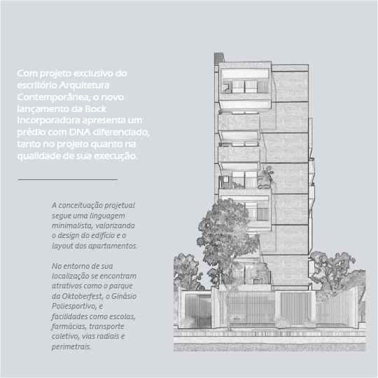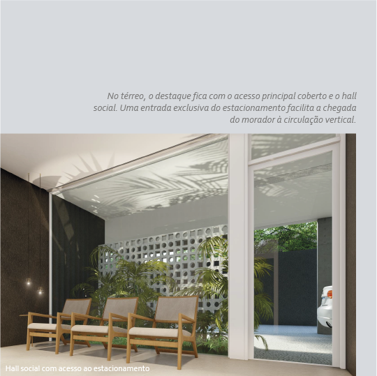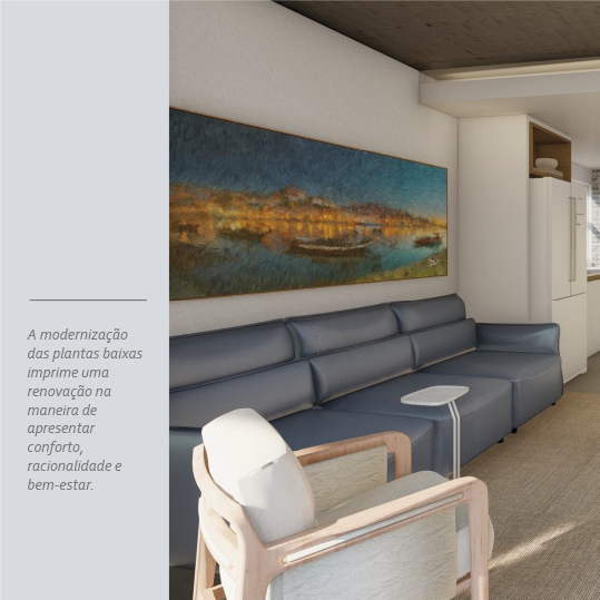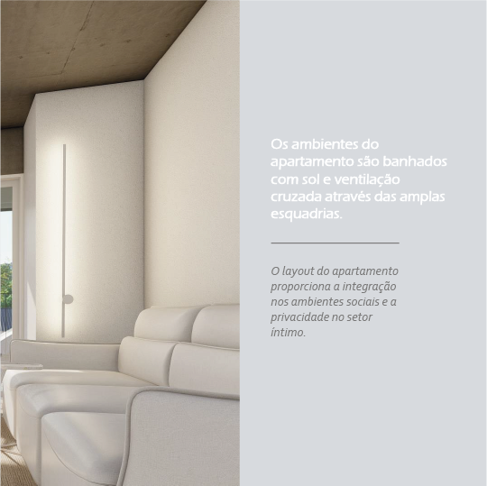 O residencial é multifamiliar com apartamentos espaçosos em versão compacta. O ambiente de estar e receber amigos tem layout integrado, moderno e despojado, privilegiando a iluminação e ventilação natural.