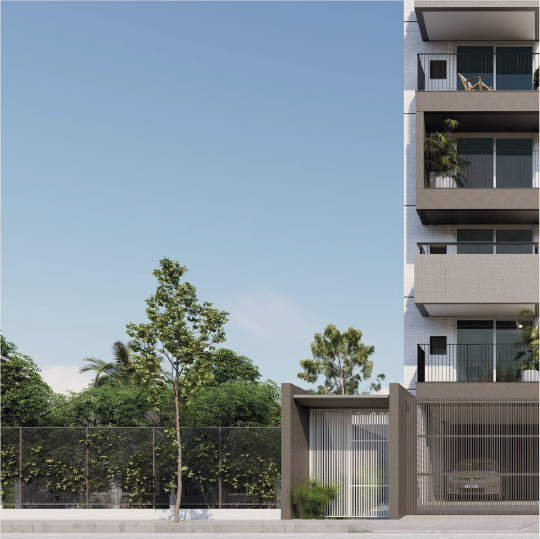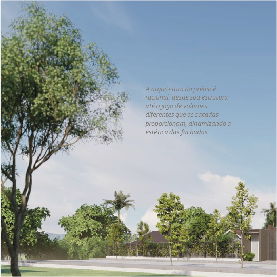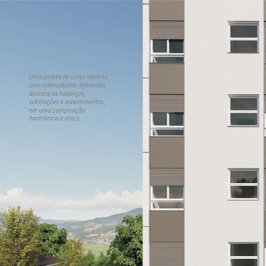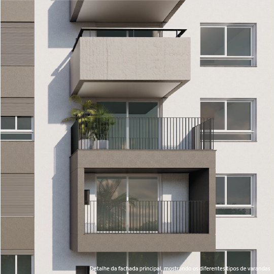 O destaque é para a volumetria das sacadas, que são modulares e se intercalam dando movimento na frente e nos fundos do prédio. As venezianas de correr fazem com que a fachada norte tenha formatações dinâmicas, conforme a posição aleatória dos painéis em cada pavimento.